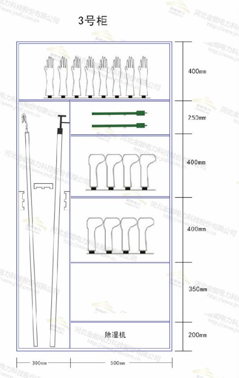 如上圖規(guī)格為2000*800mm,安全工具柜中拿出300mm寬度專門存放絕緣操作桿,其余500寬度2000mm高度分為5層,其中上面200mm用于存放驗電器,驗電器下400mm空間用于存放絕緣靴,絕緣靴下450mm用于存放絕緣手套,下面分別為350mm和400mm,中間放可移動橫板,作為后備儲藏區(qū)域,可通過可移動橫板進行上下移動,下面200mm為安全工具柜的除濕機。
